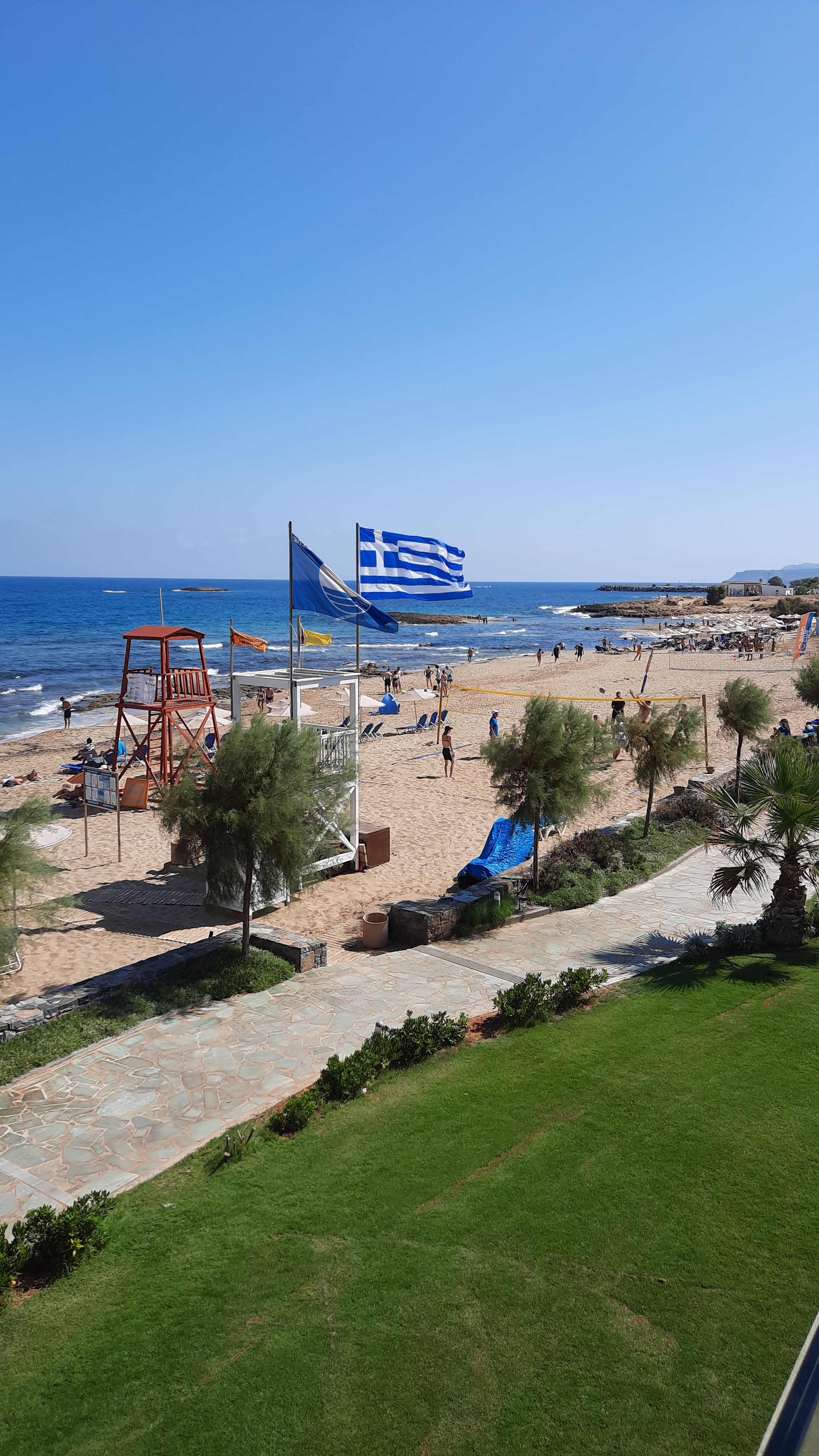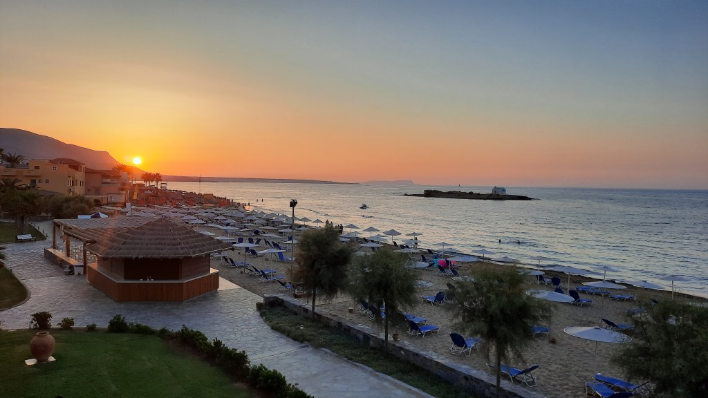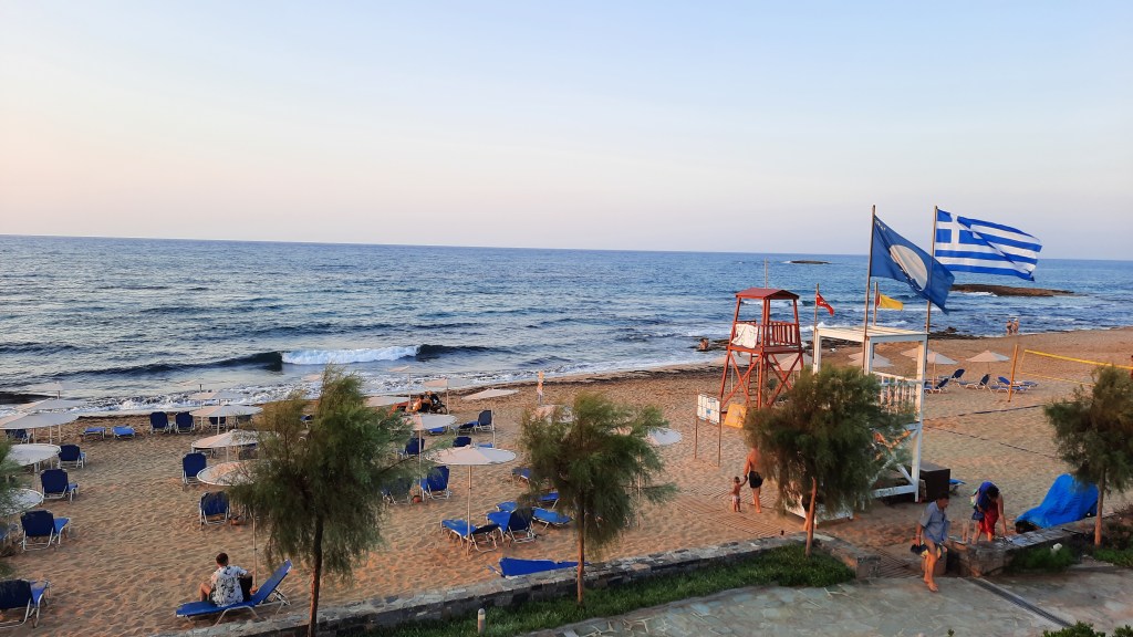 Nach etwa 45 Minuten Transfer sind wir dann im Sirens Beach Hotel in Malia angekommen. 4 Sterne mit „All inclusive“. Die Anlage ist sehr schön und in einem sehr guten Zustand. Wir haben eines der renovierten Zimmer mit Meerblick gebucht. Der Strand ist ein Traum. Flacher Einstieg, klares Wasser. Wunderschön!